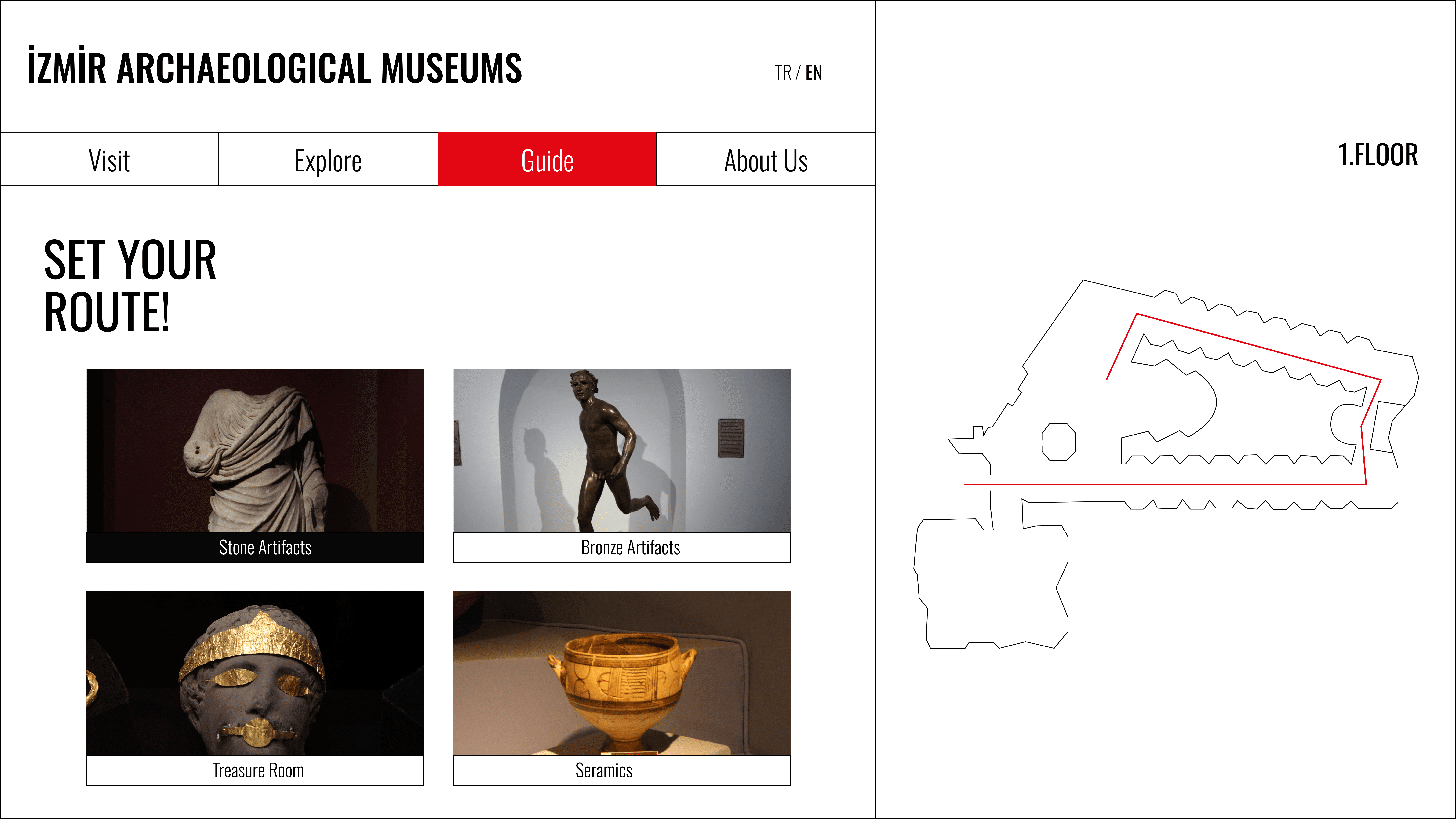 A route feature was designed to guide visitors through the museum based on artifact types and floors, supporting both digital and physical navigation.
